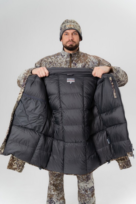 King Hunter Shelter — это самая теплая и при этом невероятно компактная пуховая куртка в коллекции бренда. Она создана для экстремальных условий: когда мороз, пронизывающий ветер и снег становятся серьезным испытанием, а охотник вынужден долгое время оставаться без движения (на номере или в засидке).